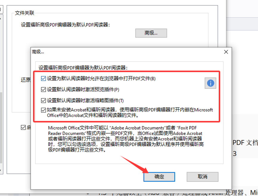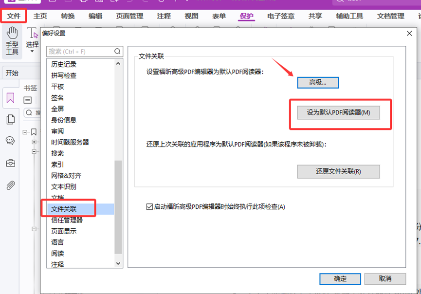 先关掉Word/Excel文件,打开福昕高级PDF编辑器,点击“文件-偏好设置-文件关联”先设置为“默认PDF阅读器”。然后点“高级”选项,将显示的四个选项全部勾选,然后点确定。待以上设置完毕之后,再去打开Word/Excel文件。