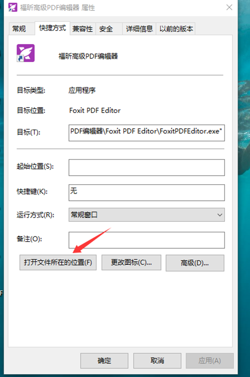 其中需要确认“FoxitPDFEditor.exe”安装路径,默认是在C盘,如果有安装在其他盘,可以右键福昕高级PDF编辑器图标,点击“打开文件所在的位置”,通过这个方式来确定安装路径,然后替换下前面FoxitPDFEditor.exe安装路径即可