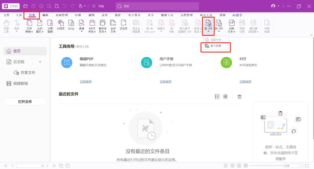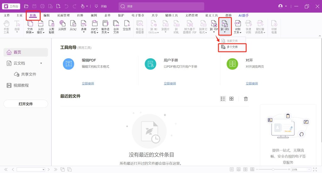 如果我们要将OFD转为PDF,点击“转换”→“到PDF”→“多个文件”;