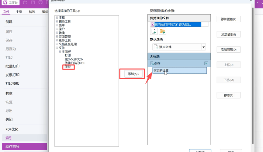 选择“文件”-“主面板”-“保存”选项添加动作并指定设置,如图所示: