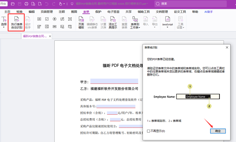 创建成一个PDF文件之后,点击编辑器“表单-执行自动表单识别”,可以将文档填写内容识别成一个PDF表单。