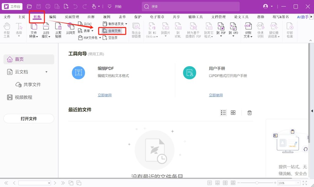 我们打开福昕高级PDF编辑器,点击“转换”→“合并文件”;