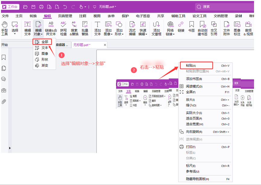 先选择“编辑对象–>全部”,然后在pdf页面上右击—>粘贴即可,这样贴出来的就是文本/图片对象。