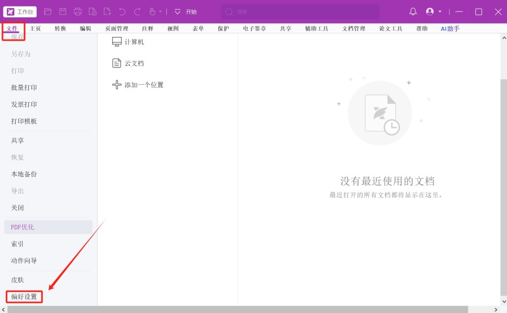 我们打开福昕高级PDF编辑器,点击左上角“文件”,拉至末端“偏好设置”;