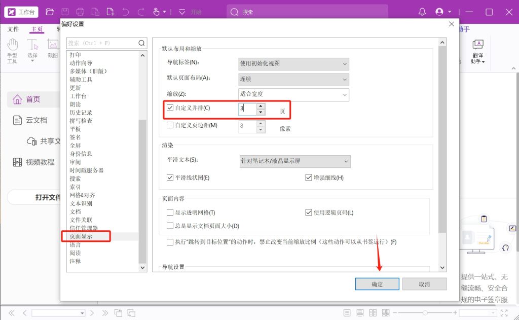 在弹出的偏好设置对话框中选择“页面显示”,勾选“自定义并排”,将并排页面修改为3页,点击“确定”保存设置;