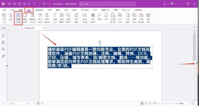 我们利用福昕高级PDF编辑器打开一份文档,点击“编辑”>“编辑文本”,然后选择要调整的文字,点击右侧小三角形打开格式面板。