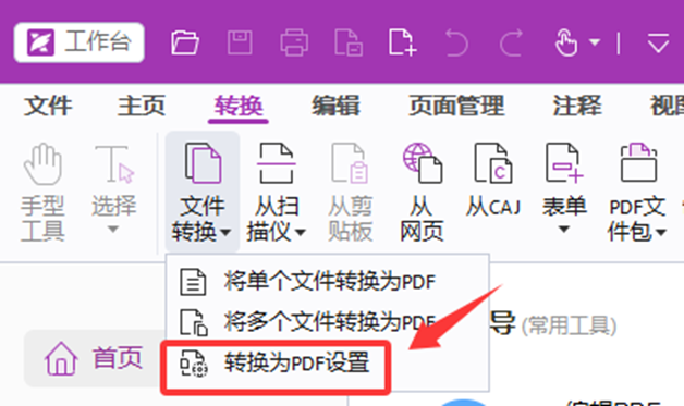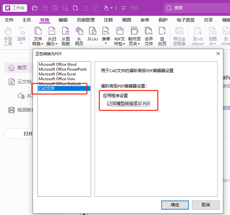 1、在福昕PDF编辑器转换菜单下,选择“文件转换”下面的转换为PDF设置,将CAD文件的参数设置项勾选上。