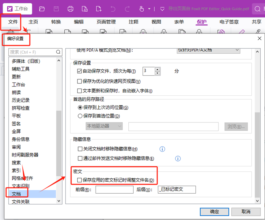 (2)在偏好设置弹窗中点“文档”,将“密文”设置项“保存应用的密文标记时调整文件名”前的勾选取消即可。