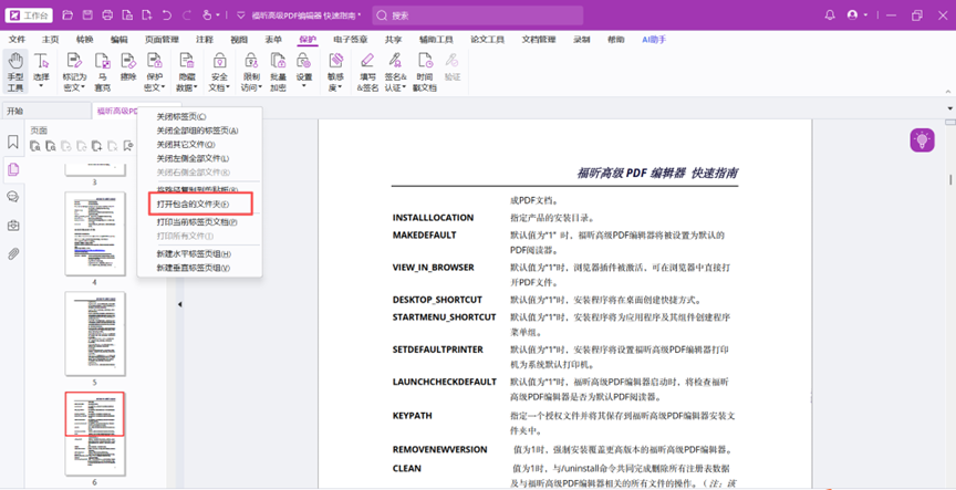 我们在使用福昕高级pdf编辑器打开文件后,在每个文件的上方都有一个标签用来显示文件的名称信息,此时我们直接使用鼠标右键点击对应的文件标签,在弹出的菜单中选择打开包含的文件夹就可以直接跳转到对文件文件所在的路径了。