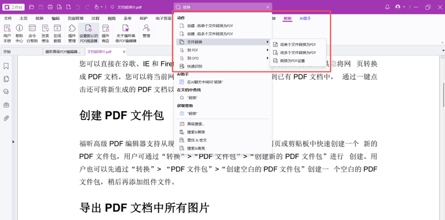 例如:此时我们想将其他格式的文件转换为PDF格式,我们在软件的搜索框中输入转换,选择对应的动作后可以直接调出对应的命令。