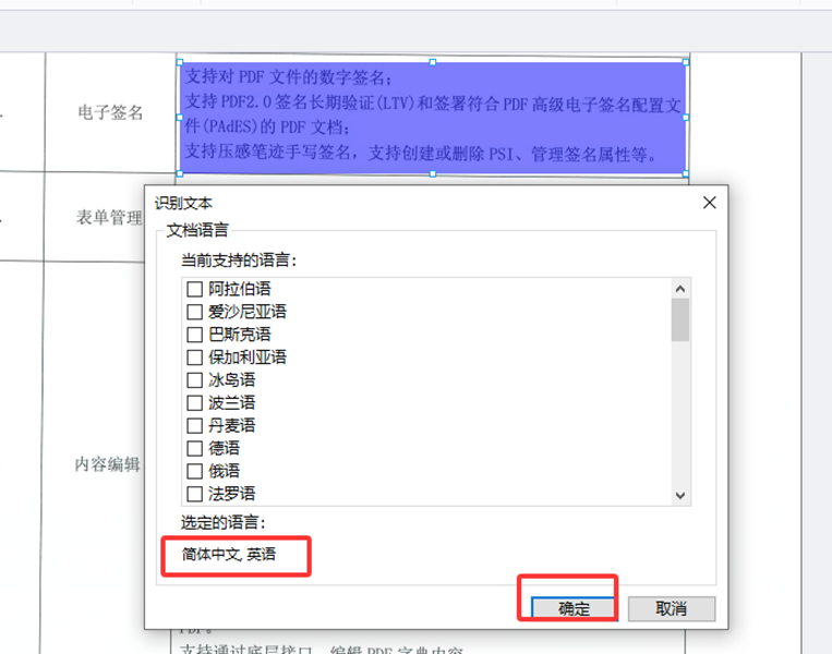 在文档中框选需要识别提取的内容,确定之后在弹出的“识别文本”方框中选择该文本所对应的识别语言,然后点“确定”。