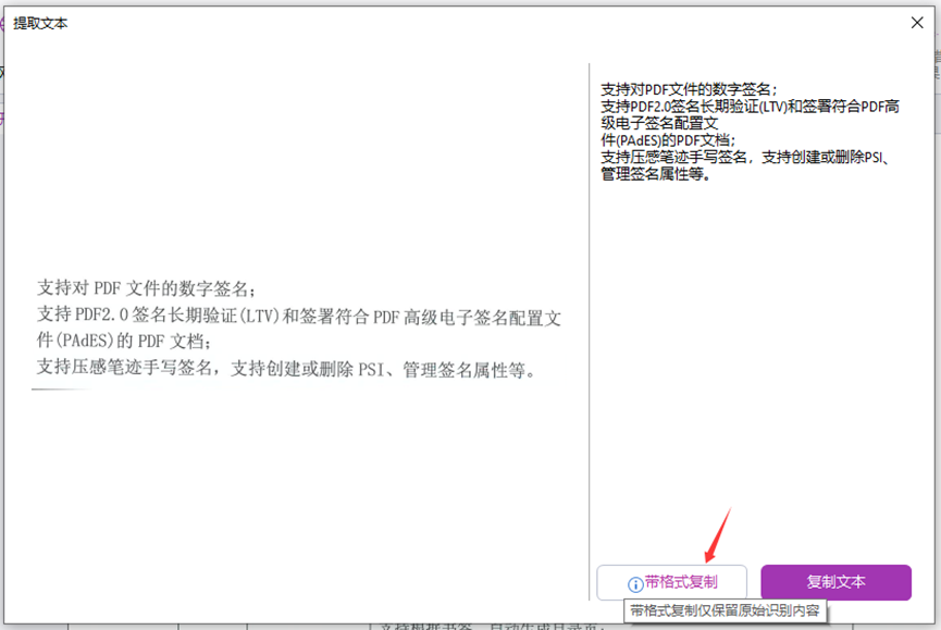 识别完毕之后,会弹出一个“提取文本”选项,可以预览识别后的内容,并支持“带格式复制”和“复制文本”两个选项。