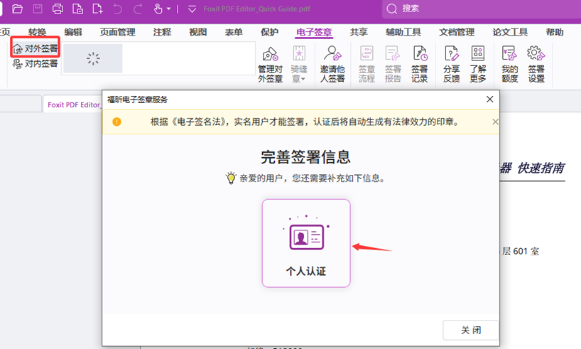 首次使用福昕电子签章对外签署前,需要先进行账号个人实名认证才可以签署文档,具有法律效力,具体操作如下: