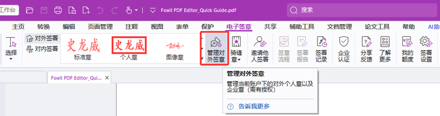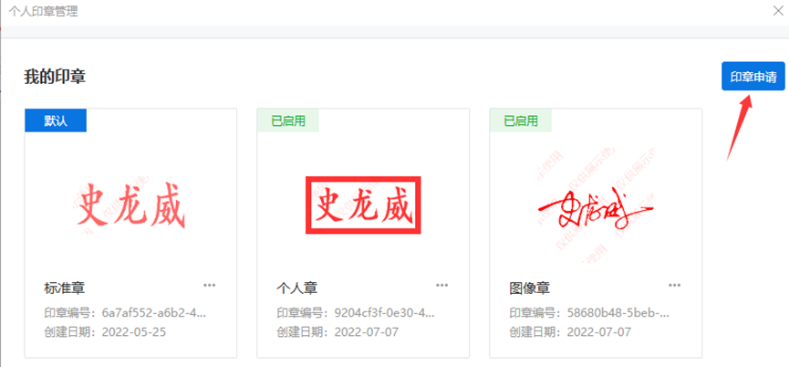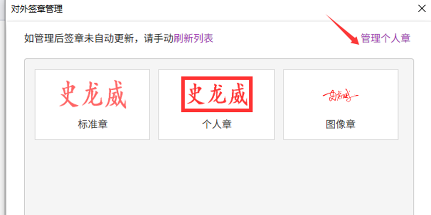 认证完毕后,面板会出现个人章的外观,也可以在“管理对外签章”中弹窗点击右上角“管理个人章-印章申请”。