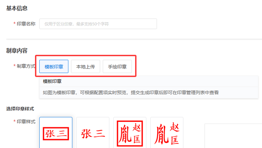 可以选择“模板印章”、“本地上传”“手绘印章”等方式添加印章外观。