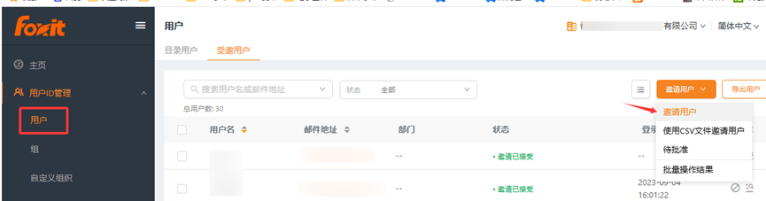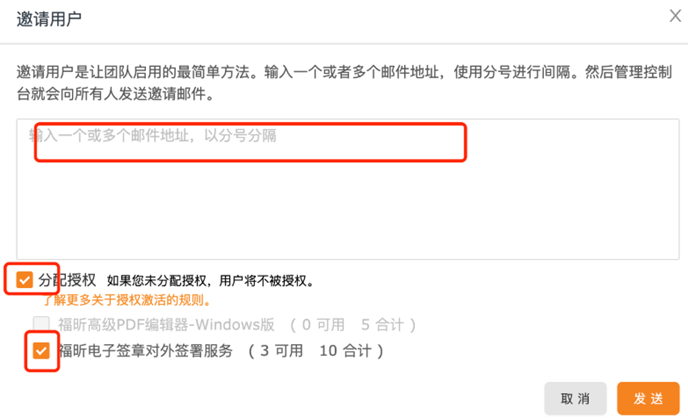 点击“用户管理-用户-邀请用户”,在邀请用户弹窗中添加用户邮箱,并直接分配对外签署授权。
