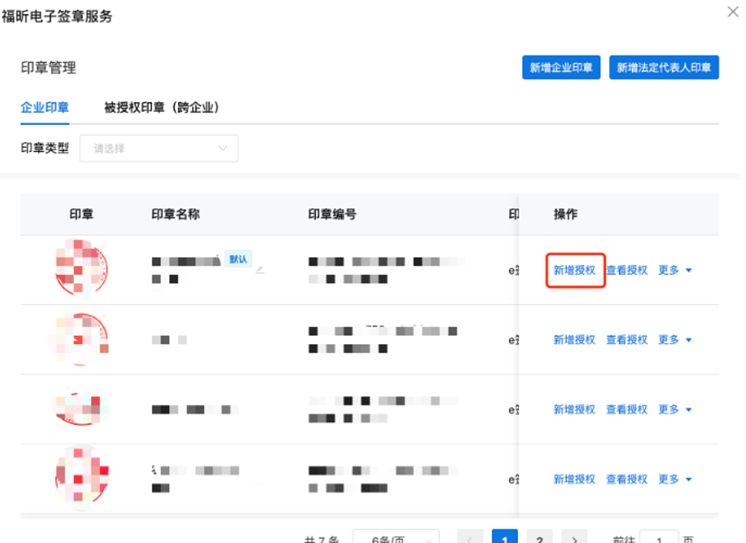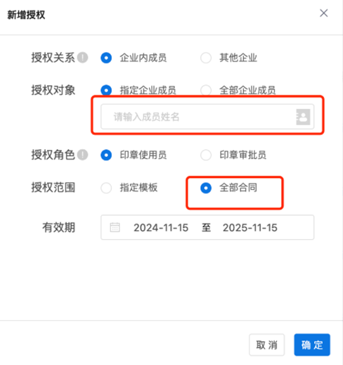 管理员点击“电子签章-企业管理-对外企业印章授权”,在印章列表中,选择需要分配授权的印章,点击右边的“新增授权”,在“授权对象”中搜索刚通过个人认证的用户,按提示完成授权操作即可。