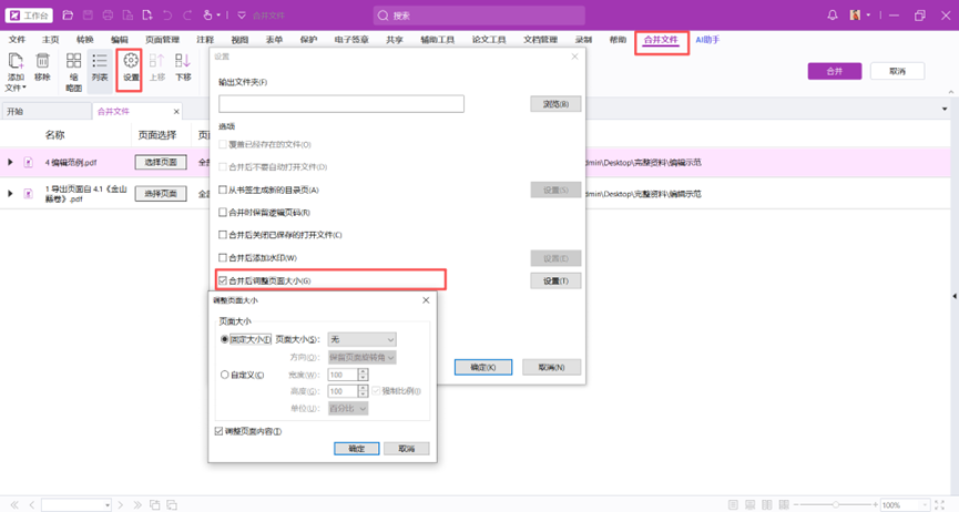 添加文件后在合并文件的菜单中点击设置-合并后调整页面大小。设置相关的页面参数后点击确定,操作完成后再对文件进行合并操作。